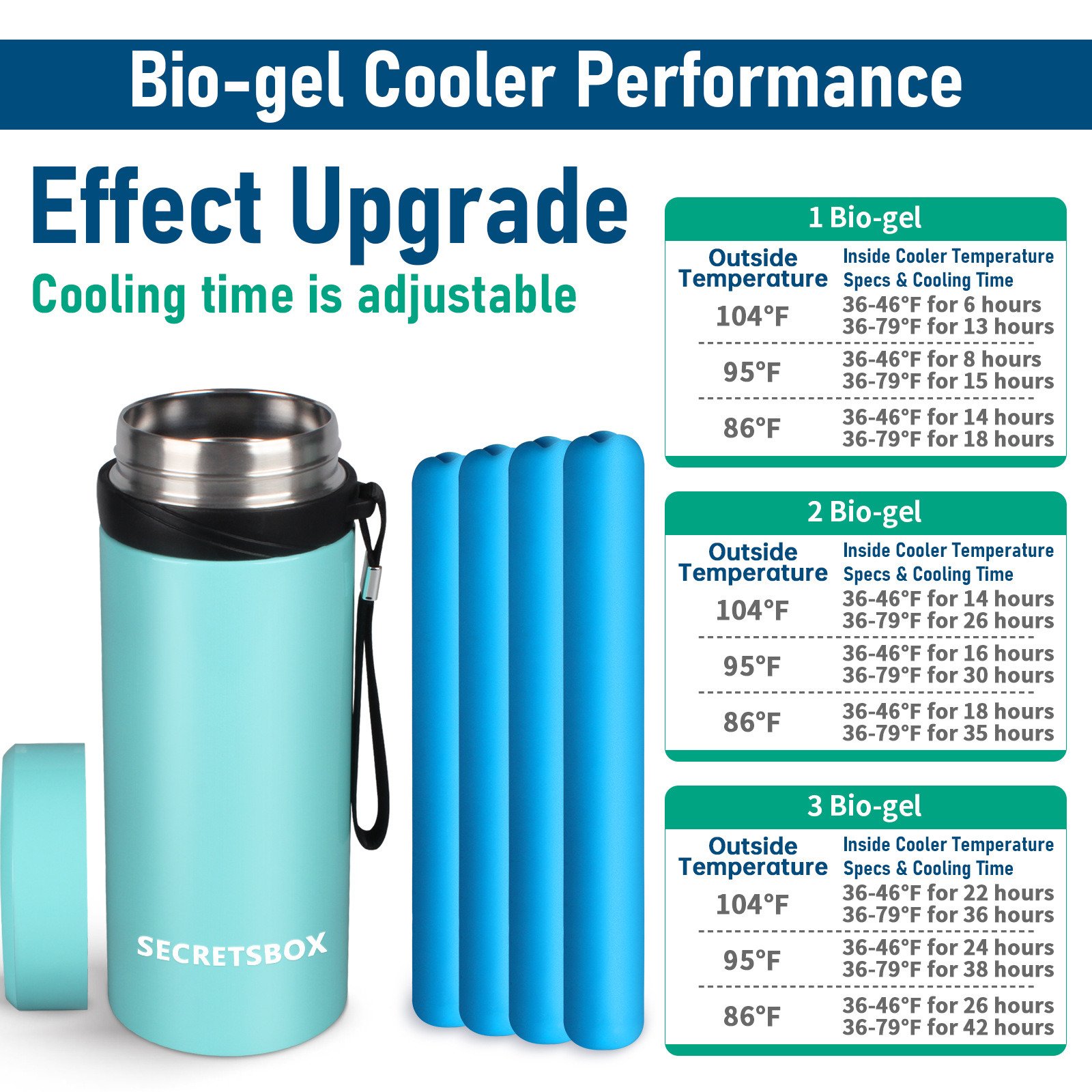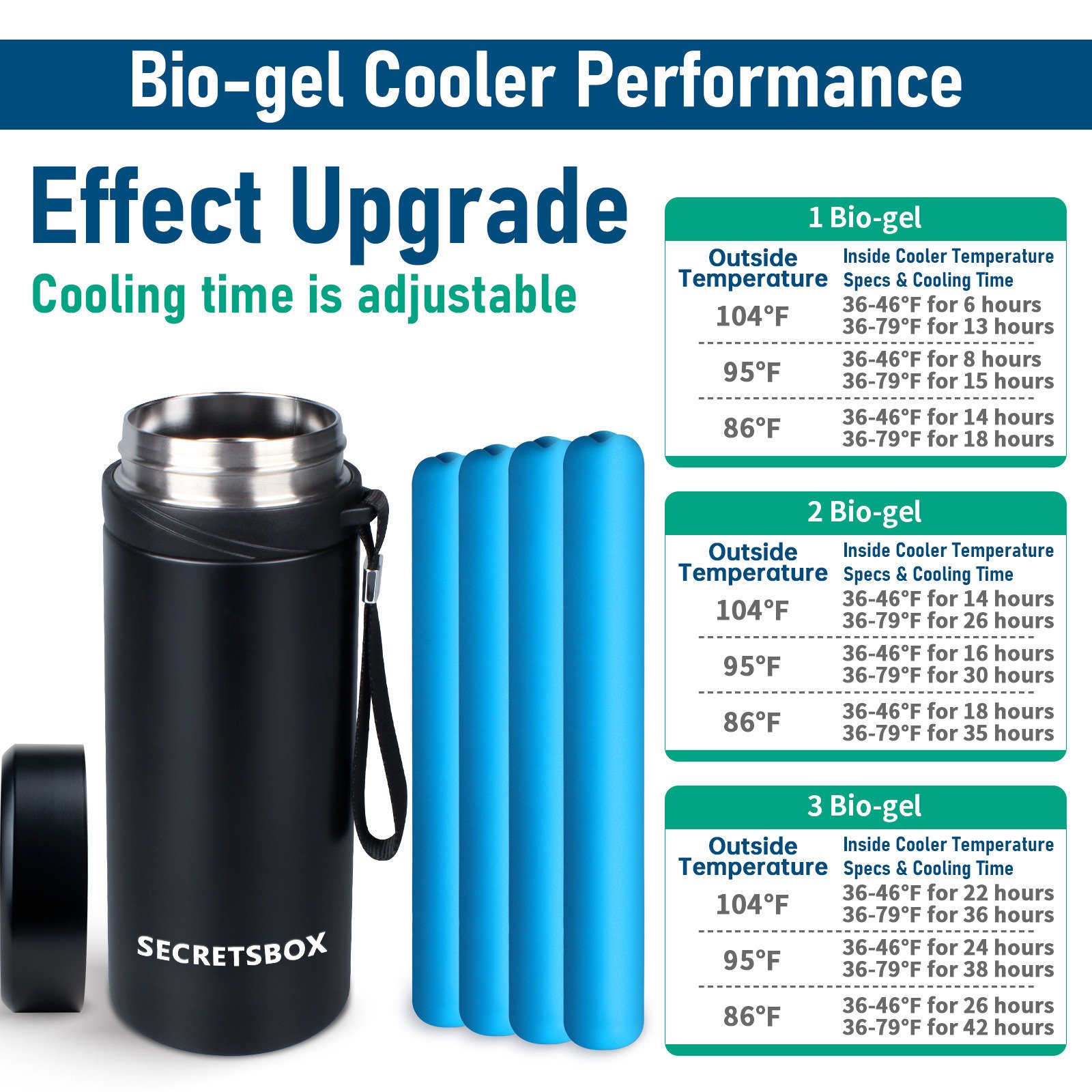304 stainless steel cup body, food grade PP material, internal high vacuum design, used with natural bio-gel cold storage bottle, can provide 2-8 °C (36-46°F)for up to 22-36 hours under ultra-high temperature environment 104 °F to ensure drug safety.